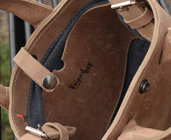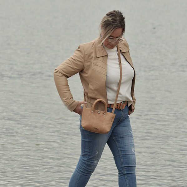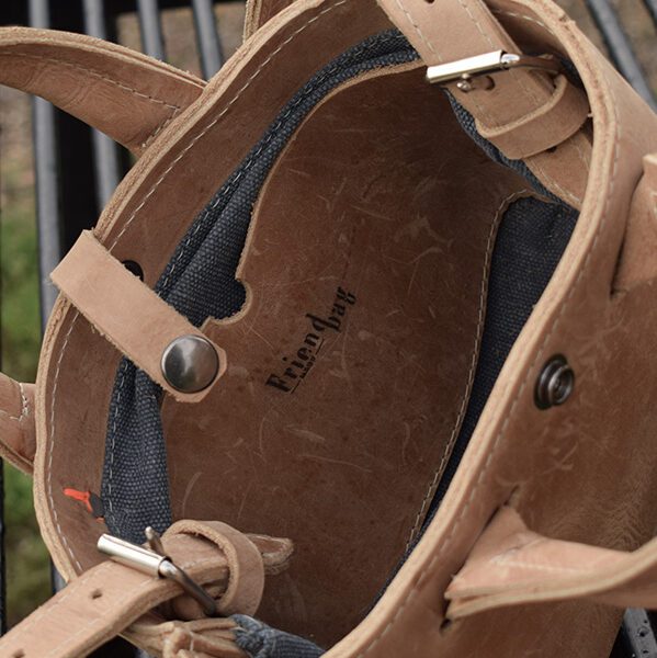 Het tasje wordt afgesloten met een drukknoop. De binnenkant is gevoerd met blauw canvas en heeft een leer vakje voor het kleine prul.