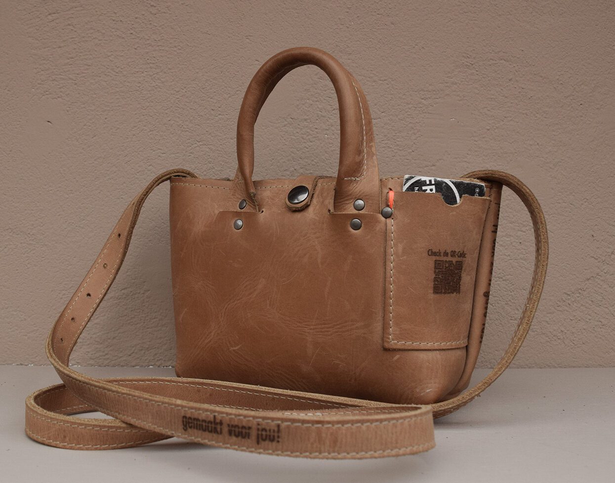 Om de tas echt jouw tas te maken kan je ervoor kiezen om er een eigen tekst op te laten graveren. Vraag naar de mogelijkheden.