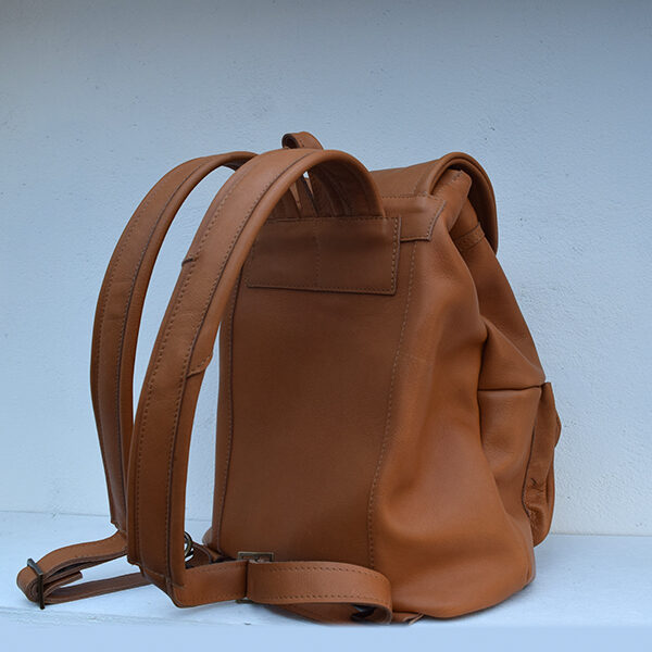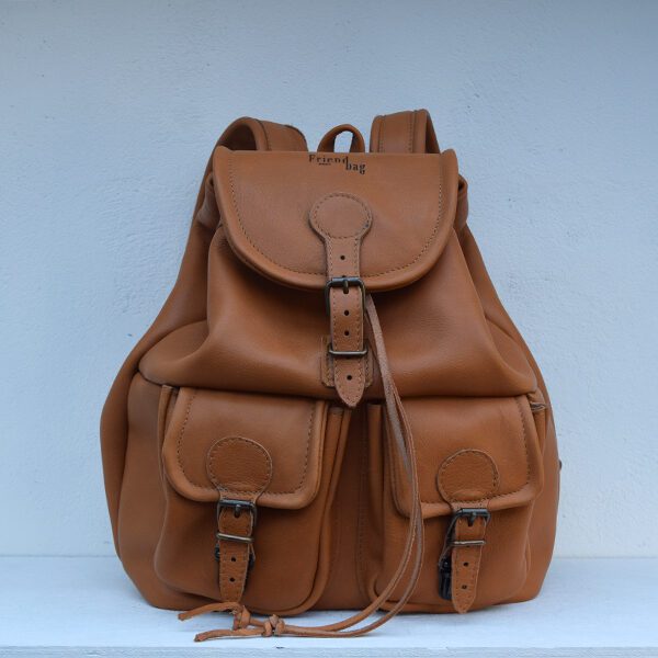 De rugtas is vervaardigd uit glad cognac kleurig rundleer met een soepele maar stevige structuur. Het hoofdvak biedt ruime opbergmogelijkheden voor dagelijkse benodigdheden zoals een laptop, documenten of persoonlijke items. De twee voorvakken met gespsluiting zorgen voor extra overzicht en snelle toegang tot kleinere accessoires.